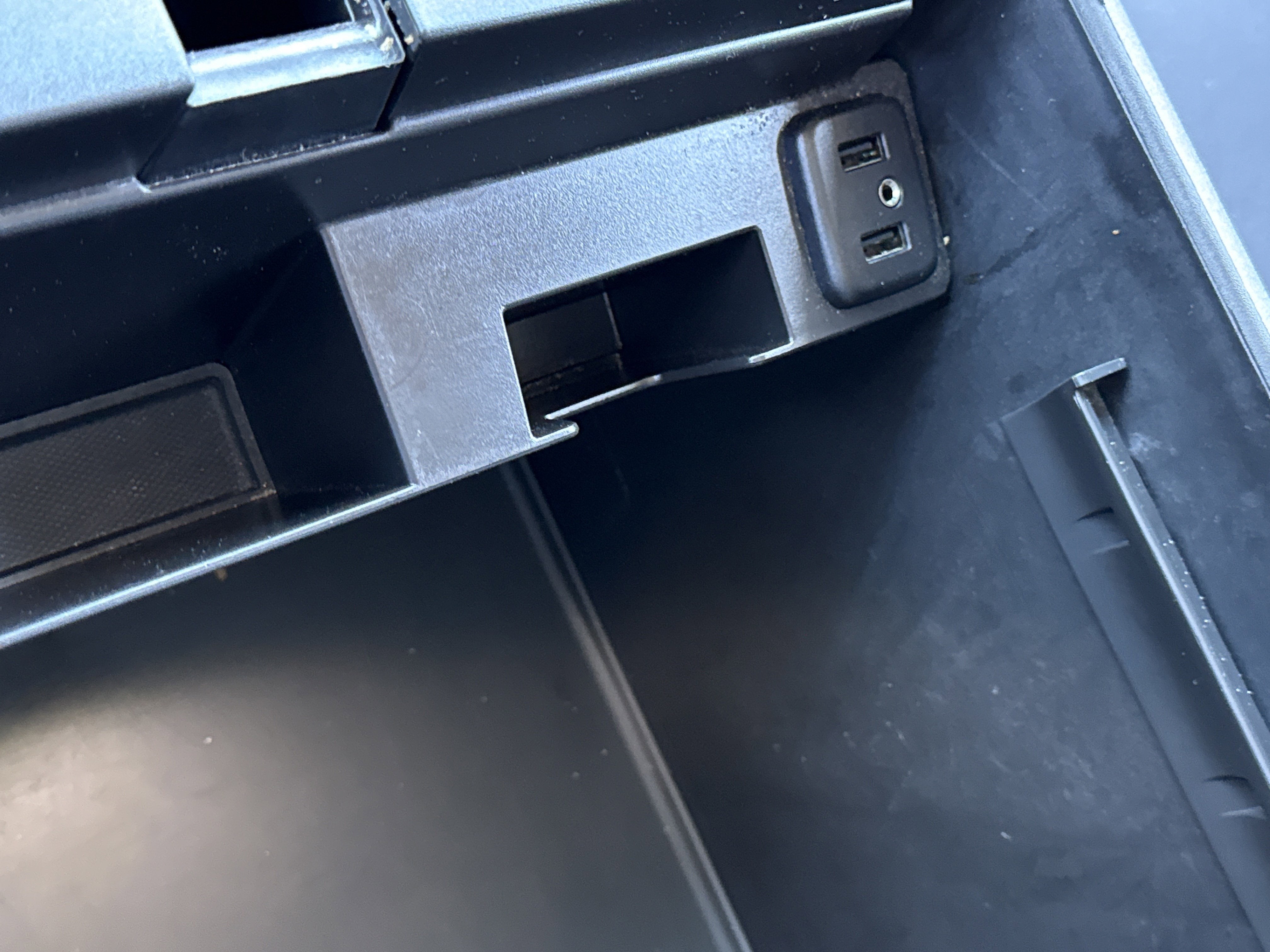 - Console, floor with storage area, cup holders and auxiliary jack