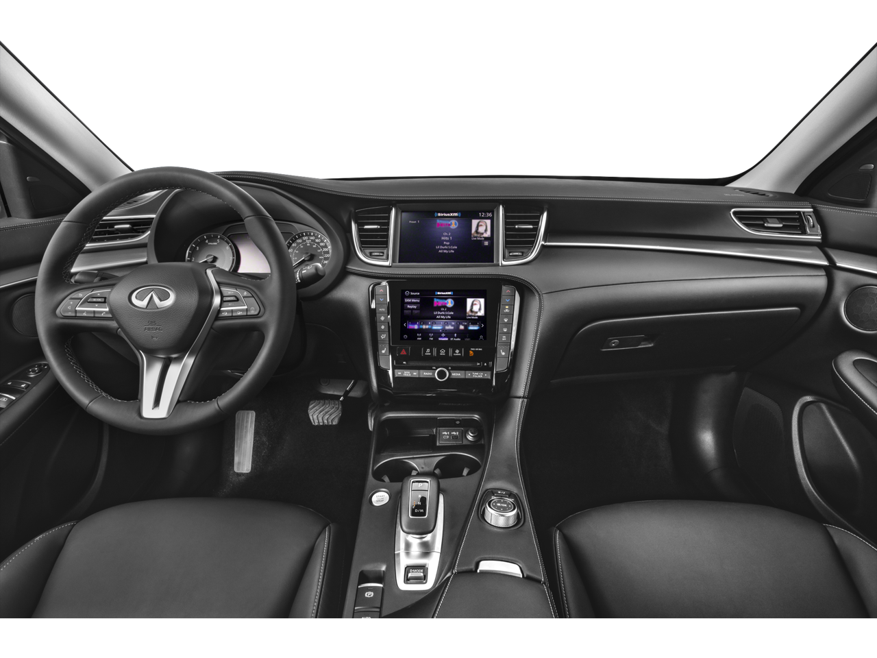 - Radio: HD Audio System -inc: INFINITI InTouch, INFINITI InTouch services, INFINITI InTouch dual display system w/upper 8" and lower 7" HD touch screens, wireless Apple CarPlay, Android Auto, HD radio technology, SiriusXM radio w/advanced audio features and 90-day complimentary trial, INFINITI voice recognition, Siri Eyes Free, Wi-Fi hotspot and active noise cancellation