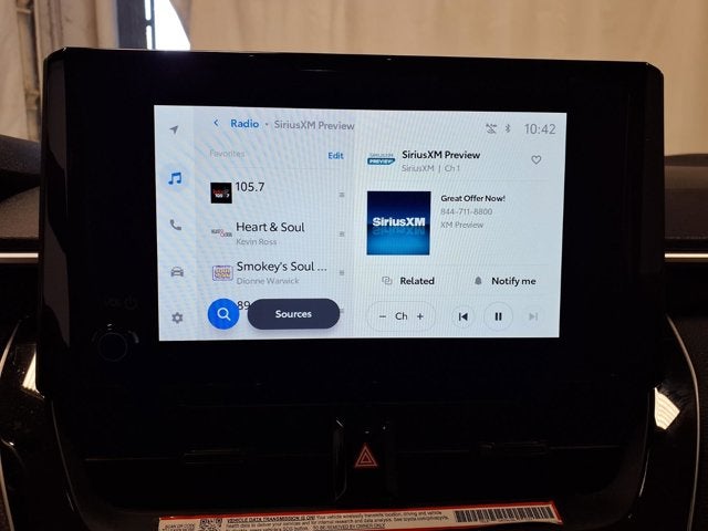 This vehicle comes equipped with: 1.8L DOHC 16V VVT, 4-Wheel Disc Brakes, 6 Speakers, ABS brakes, Air Conditioning, AM/FM radio: SiriusXM, Apple CarPlay/Android Auto, Auto High-beam Headlights, Automatic temperature control, Brake assist, Bumpers: body-color, Delay-off headlights, Driver door bin, Driver vanity mirror, Dual front impact airbags, Dual front side impact airbags, Electronic Stability Control, Emergency communication system: Safety Connect (up to 10-year trial subscription), Exterior Parking Camera Rear, Four wheel independent suspension, Front anti-roll bar, Front Bucket Seats, Front Center Armrest, Front reading lights, Fully automatic headlights, Illuminated entry, Knee airbag, Low tire pressure warning, Occupant sensing airbag, Outside temperature display, Overhead airbag, Panic alarm, Passenger door bin, Passenger vanity mirror, Power door mirrors, Power steering, Power windows, Premium Fabric Seat Trim, Radio data system, Radio: 8 Toyota Audio Multimedia, Rear anti-roll bar, Rear seat center armrest, Rear side impact airbag, Rear window defroster, Remote keyless entry, Speed control, Split folding rear seat, Steering wheel mounted audio controls, Tachometer, Telescoping steering wheel, Tilt steering wheel, Traction control, Trip computer, and Wheels: 16 Wide Vent Steel.