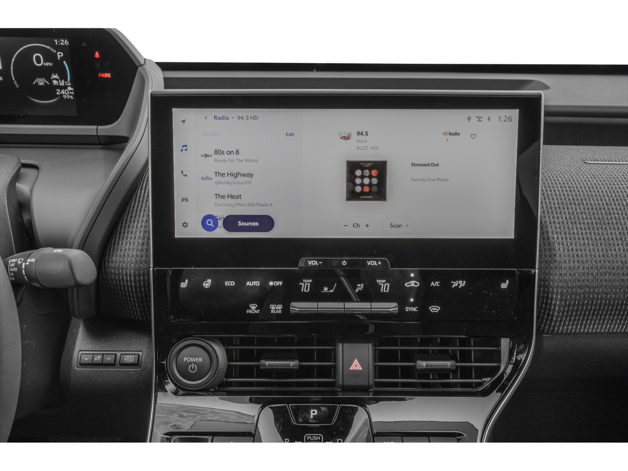 This vehicle comes equipped with: 4-Wheel Disc Brakes, 6 Speakers, ABS brakes, Air Conditioning, Alloy wheels, AM/FM radio: SiriusXM, Apple CarPlay/Android Auto, Auto High-beam Headlights, Auto-dimming Rear-View mirror, Automatic temperature control, Brake assist, Bumpers: body-color, Delay-off headlights, Driver door bin, Driver vanity mirror, Dual front impact airbags, Dual front side impact airbags, Electronic Stability Control, Emergency communication system: Safety Connect (10-year trial), Exterior Parking Camera Rear, Fabric and SofTex Seat Trim, Four wheel independent suspension, Front anti-roll bar, Front Bucket Seats, Front Center Armrest, Front dual zone A/C, Front reading lights, Front Seats, Fully automatic headlights, Heated door mirrors, Illuminated entry, Knee airbag, Leather steering wheel, Low tire pressure warning, Navigation system: Drive Connect (3 year trial) includes Cloud Navigation with real time traffic and Google POI, Occupant sensing airbag, Outside temperature display, Overhead airbag, Overhead console, Panic alarm, Passenger door bin, Passenger vanity mirror, Power door mirrors, Power driver seat, Power Liftgate, Power steering, Power windows, Radio data system, Radio: 12.3 Toyota Multimedia Audio with 6 Speakers, Rain sensing wipers, Rear anti-roll bar, Rear seat center armrest, Rear window defroster, Remote keyless entry, Security system, Speed control, Speed-sensing steering, Split folding rear seat, Spoiler, Steering wheel mounted audio controls, Telescoping steering wheel, Tilt steering wheel, Traction control, Trip computer, Turn signal indicator mirrors, Variably intermittent wipers, and Wheels: 18 Alloy with Two-Tone Covers.