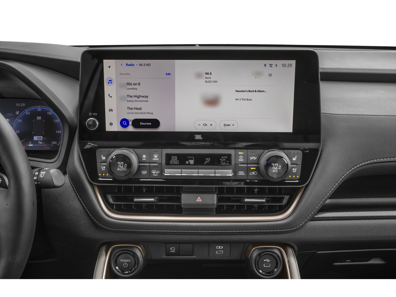 This vehicle comes equipped with: 2.4L 4-Cylinder, 11 Speakers, 3rd row seats: split-bench, 4-Wheel Disc Brakes, ABS brakes, Air Conditioning, Alloy wheels, AM/FM radio: SiriusXM, Apple CarPlay/Android Auto, Auto High-beam Headlights, Auto-dimming Rear-View mirror, Automatic temperature control, Brake assist, Bumpers: body-color, Delay-off headlights, Driver door bin, Driver vanity mirror, Dual front impact airbags, Dual front side impact airbags, Electronic Stability Control, Emergency communication system: Safety Connect (up to 10-year trial subscription), Exterior Parking Camera Rear, Four wheel independent suspension, Front anti-roll bar, Front Bucket Seats, Front Center Armrest, Front dual zone A/C, Front fog lights, Front reading lights, Fully automatic headlights, Garage door transmitter: HomeLink, Heads-Up Display, Heated and Ventilated Front Seats, Heated door mirrors, Heated front seats, Heated rear seats, Heated steering wheel, Illuminated entry, Knee airbag, Leather Shift Knob, Leather steering wheel, Low tire pressure warning, Memory seat, Navigation system: Drive Connect Cloud Navigation (1-year trial subscription), Occupant sensing airbag, Outside temperature display, Overhead airbag, Overhead console, Panic alarm, Passenger door bin, Passenger vanity mirror, Power door mirrors, Power driver seat, Power Liftgate, Power moonroof, Power passenger seat, Power steering, Power windows, Radio: 12.3 Toyota Audio Multimedia with JBL Audio, Rain sensing wipers, Rear air conditioning, Rear anti-roll bar, Rear reading lights, Rear window defroster, Rear window wiper, Reclining 3rd row seat, Remote keyless entry, Security system, Speed control, Speed-sensing steering, Split folding rear seat, Spoiler, Steering wheel mounted audio controls, Telescoping steering wheel, Tilt steering wheel, Traction control, Trip computer, Turn signal indicator mirrors, Ultrasuede/Leather Seat Trim, Variably intermittent wipers, Ventilated front seats, Ventilated rear seats, and Wheels: 20 2-Tone Multi-Spoke Aluminum.